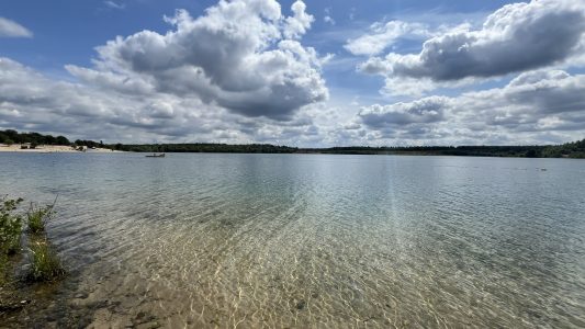 Nun war er aber da, der große Tag. Wie erwartet hat sich meine Nervosität gelegt, je mehr ich von der Lokalität gesehen habe, insbesondere den See. Ich habe wie in den Trainings alles in der Wechselzone vorbereitet. Ich habe mich auch dazu entschieden, die Schuhe während dem Fahrradfahren anzuziehen, wenn schon, denn schon. Die Zeit zwischen Rad-Checkin und Start verflog schnell. Ich fing an, mich in meinen Neo zu pellen. Auch hier lief alles gut, wie getestet. Nun ging es zum Einschwimmen, dies half mir auch, mich mit dem Wasser anzufreunden und ruhig zu werden, nun konnte ich mich wirklich konzentrieren. Noch 10 Minuten bis zum Start. Ich entschied mich, mich mitten in die Masse zu stellen. Wenn schon Massenstart, dann richtig. Und schon ging es los, ich war mittendrin, musste häufig hochschauen, da es sehr unübersichtlich war. Die ein oder anderen Gliedmaßen haben sich mit meinen verhakt, das habe ich aber ignoriert. Ich bin einfach meinen Stiefel geschwommen und habe auch ausgeteilt, wenn jemand anderes in die Quere kam. Nach ca. 500m kam ich einigermaßen in einen Rhythmus. Es fühlte sich an, als würde ich Leute überholen… Es war aber, glaube ich, eher andersherum. Ich kam unter den letzten aus dem Wasser, aber ich habe es geschafft! 1,5 km gekrault. Also eigentlich schon gewonnen! Das war mein erstes Ziel (auch wenn es mich immer noch ein wenig wurmt, so weit hinten gewesen zu sein…)